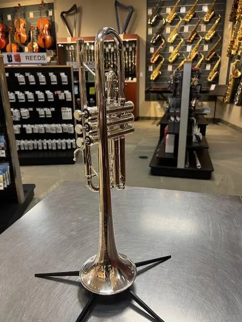 Each Artisan C trumpet is made with a one-piece hand-hammered yellow brass bell with a flat rim and special acoustic treatment in both material and manufacturing process resulting in a beautiful Bach Stradivarius sound with a larger core and a broader range of colour. The two-piece valve construction with nickel balusters and brass casings harkens back to the construction techniques used by Vincent Bach when making classic Bach trumpets in New York City and Mount Vernon, New York. Monel pistons along with two sets of brass and plastic valve guides offer the player a choice in response and feel. The 3rd valve tone enhancing ring offers yet another choice in response. The 1st slide split ring, enhanced radius ferrules, sculpted bracing, and artistic engraving are all key contributors to the unique response while providing an unparalleled elegance in appearance. The silver-plate finish of the AC190S provides a controlled brilliance to the overall sound. These features combined with a .462" large bore allow the player to produce a spectacular sound well suited for any concert hall.