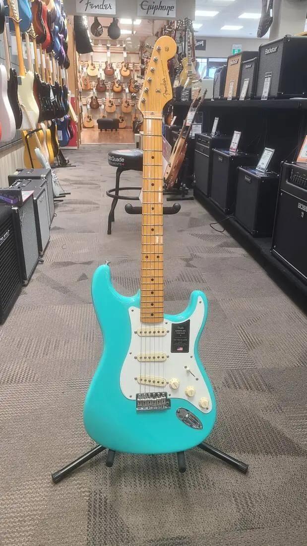Offered in three stunning nitrocellulose lacquer finishes 2-Colour Sunburst and Sea Foam Green over alder and Vintage Blonde over ash the American Vintage II 1957 Stratocaster celebrates a true icon of Fender instrument design.