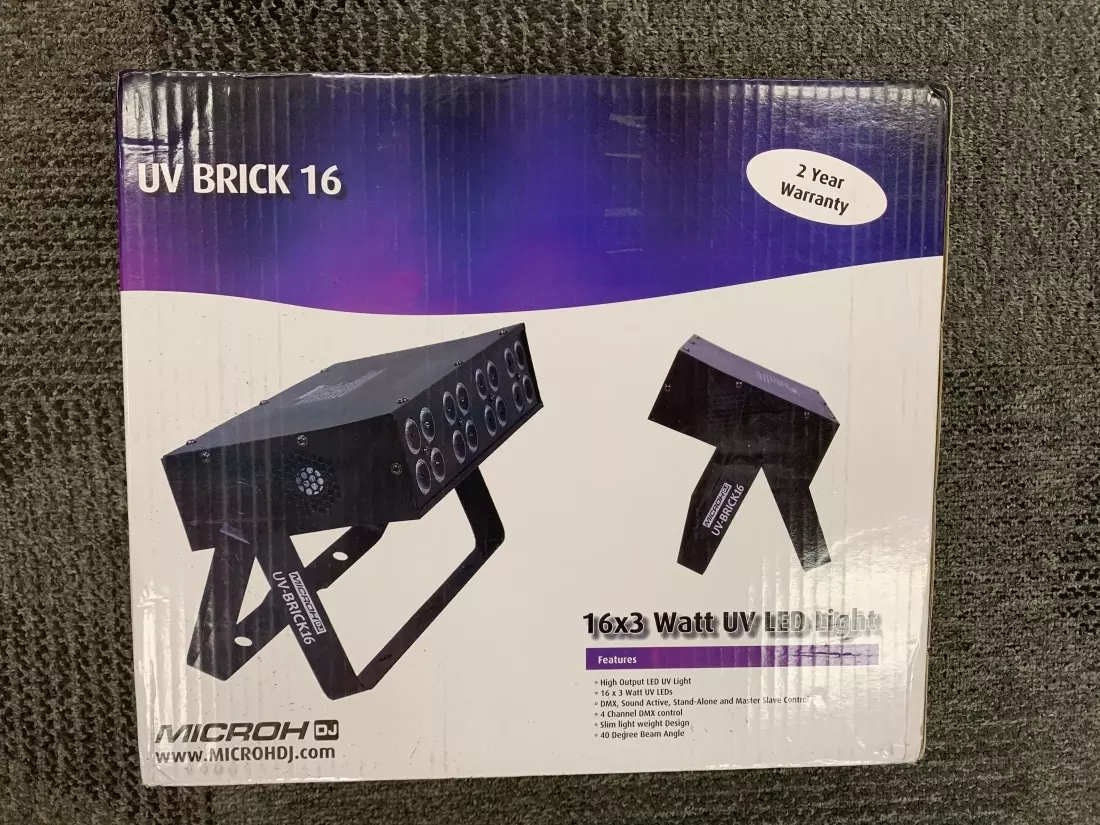 The UVBRICK16 is a high output UV Blacklite. The unit produces a very wide 40 degree beam angle to deliver a splash of UV light throughout your venue. The unit can be controlled via DMX, Master Slave, Full On and Sound Active. Great for mobile DJs, bowling alleys, banquet halls and medium-size night clubs. No duty cycle, so run all night.