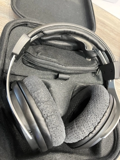 The included storage case, replacement set of Alcantara ear pads, AND replacement cable.