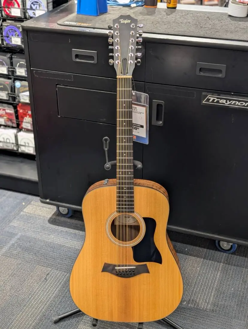 150e For years, Taylor's sleek, ultra-playable necks have helped define a great 12-string experience. The 12-string Dreadnought 150e fits that signature playability and tonal clarity into an affordable package, making a quality 12-string more accessible to budget-minded players looking to broaden their musical palette. The Dreadnought bodys strong low-end response balances well with the crisp octave shimmer, producing a tone that's lush and articulate, with lots of dynamic range. Features include layered walnut back and sides, a solid Sitka spruce top, 1-7/8-inch neck, matte-finish body, black binding and pickguard, and natural-sounding Taylor's Expression System 2 pickup.