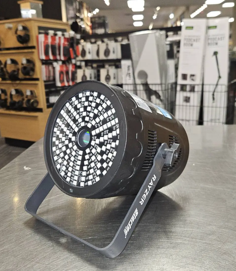 The Rayzer is light weight, compact and easy to use. It's designed for mobile entertainers on the go as well as installations in small club, bars, roller rinks and entertainment centers. The fixture may be used in sound active, show mode or controlled by DMX. Multiple fixtures may be linked together via DMX cable for a high impact lightshow.