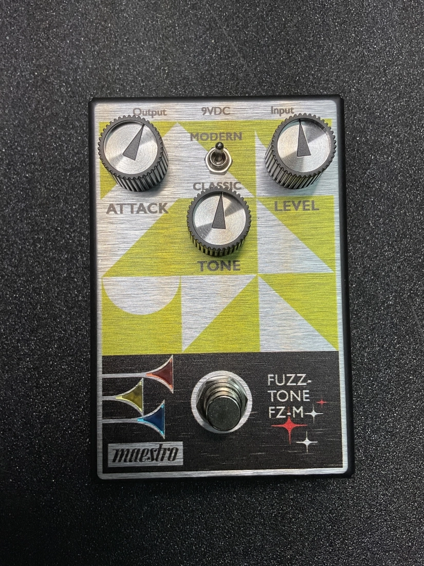 Maestro created the world's first fuzz pedal - the Maestro Fuzz-Tone FZ-1 - the legendary sound on the Rolling Stones "(I Can't Get No) Satisfaction." Welcome to the FZ-M. This all-analog pedal boasts two-in-one functionality for increased sonic versatility with both an FZ-1 inspired fuzz sound and a thicker, more modern fuzz tone. Its 3-knob control layout gives you intuitive control. The Attack knob controls the amount of fuzz. The Tone control lets you adjust the timbre from bright and raspy to warm and wooly and anywhere in between. Use the Level control to set the output volume; it can go way beyond unity gain when desired. The true bypass footswitch triggers the LED lights in the bugles in the Maestro logo when it's on, so you'll always know when the effect is active.