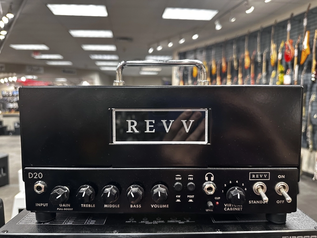 The Revv D20 is an inspiring all-tube clean & crunch amp with Two notes Torpedo-embedded reactive load & virtual cabinets. This all-tube head has an optional reactive load for organic feel and tone when playing without a cab, and hosts virtual cabinets onboard for direct recording, silent playing, and live performance without a microphone. The Revv D20 has you covered.