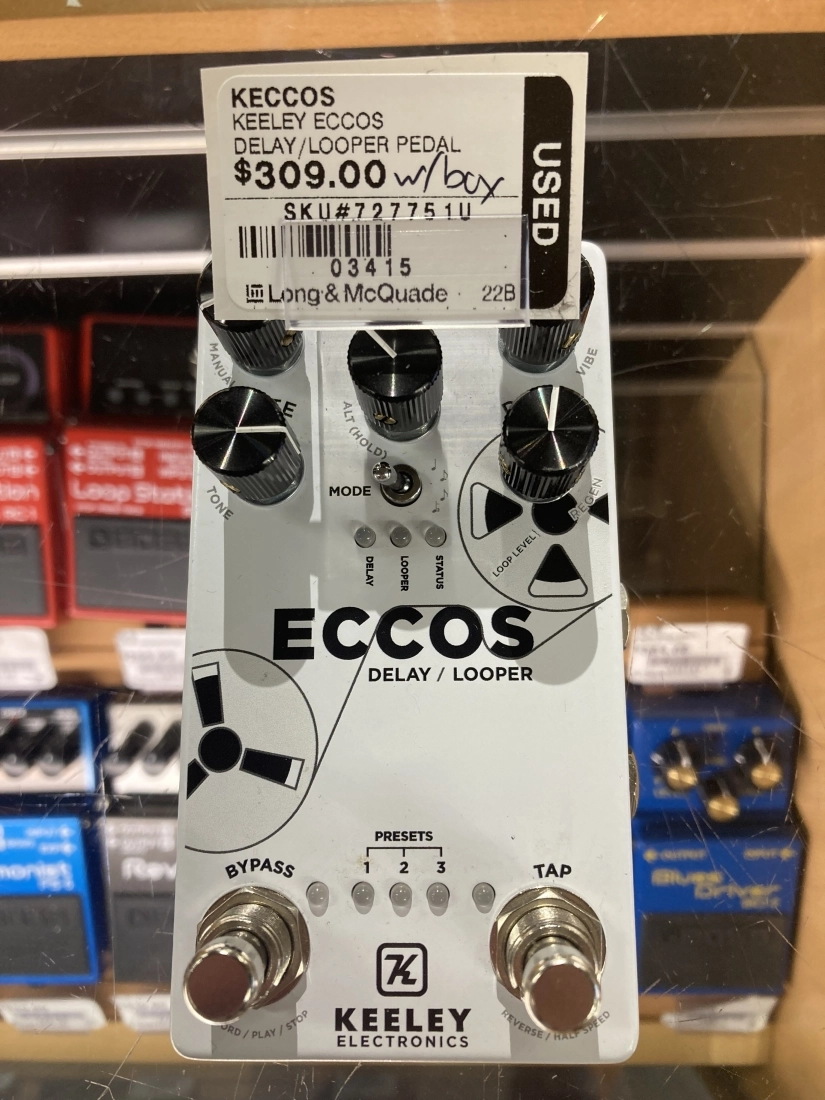 The ECCOS Delay Looper is based on a new stereo, flanged delay tone. Create beautiful sounding tape style delay lines and then spin them endless with the Looper! Designed to be at home in live pro rigs or bedroom studios while experimenting. The Keeley ECCOS is a delay-looper workstation with superb sound quality and abundant features.