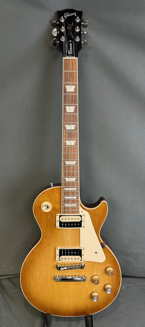 The Gibson Les Paul Classic combines the early 60's style Les Paul model with some functional and time-tested modifications. As expected, the LP Classic is crafted with a mahogany back and maple top coupled with a slim taper mahogany neck and bound, rosewood fingerboard. Burstbucker 61R & 61T zebra, open-coil pickups provide classic Gibson tones from the era with a bit of extra punch thanks to the open coils. The control assembly features 4 push-pull pots which provide choices of coil tapping, phase switching and pure bypassing for functional and versatile sonic variety.