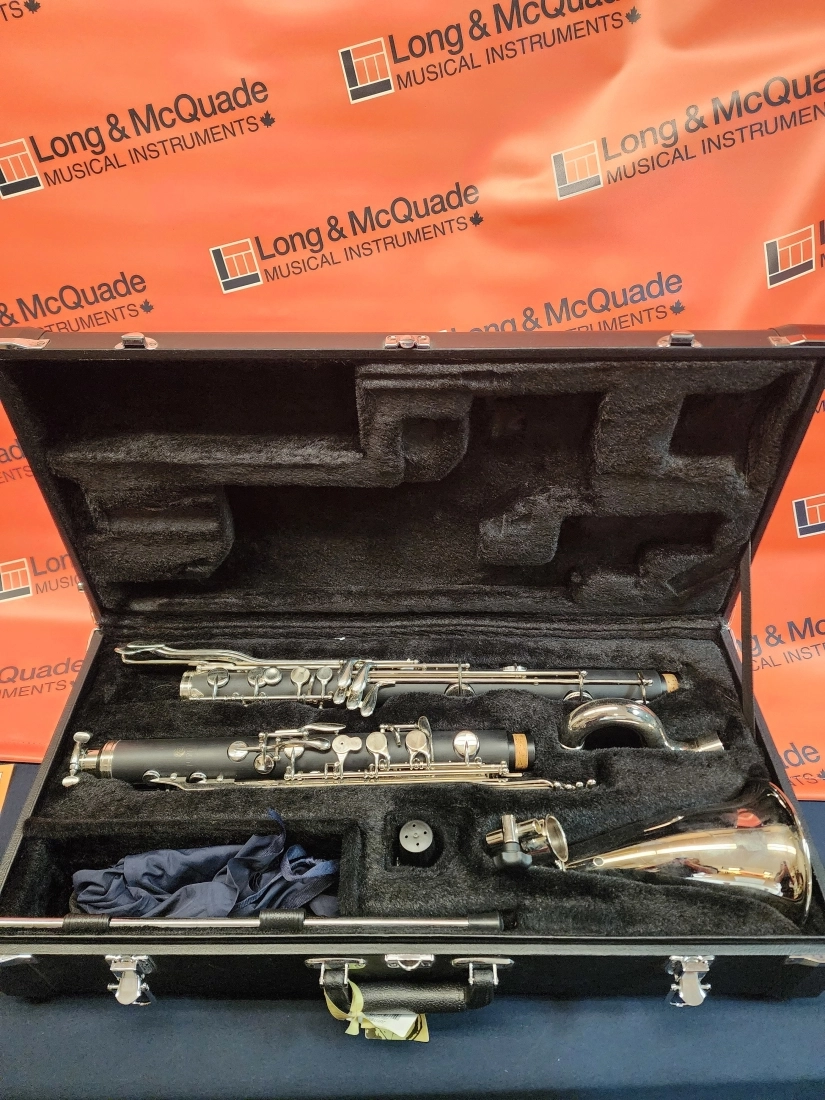 The Jupiter JBC1000N Bass Clarinet is at home in a school's band, orchestra, jazz ensemble, or a recording studio. The Jupiter JBC1000N Bass Clarinet has a 2-piece body with an adjustable floor peg, inline trill keys, undercut tone holes, and comes with a space efficient wood-frame case.