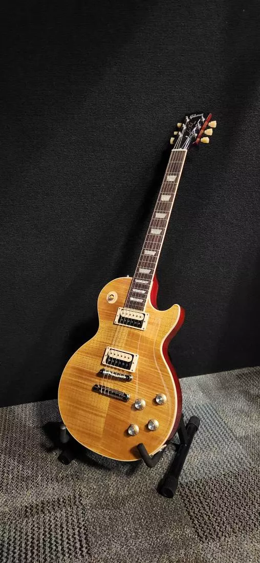 Gibson and Slash are proud to present the Slash Collection Gibson Les Paul™ Standard. It represents influential Gibson guitars Slash has used during his career, inspiring multiple generations of players around the world. The Slash Collection of Gibson guitars can be seen live on stage with Slash today. Each Slash Collection Gibson Les Paul Standard features a AAA flamed maple top, a solid mahogany body, and Slash's personal touches including a 50s neck profile, Gibson Custom BurstBucker™ Alnico 2 pickups, color-coordinated hardware appointments, hand-wired electronics with Orange Drop® capacitors, and a vintage-style brown hardshell case.