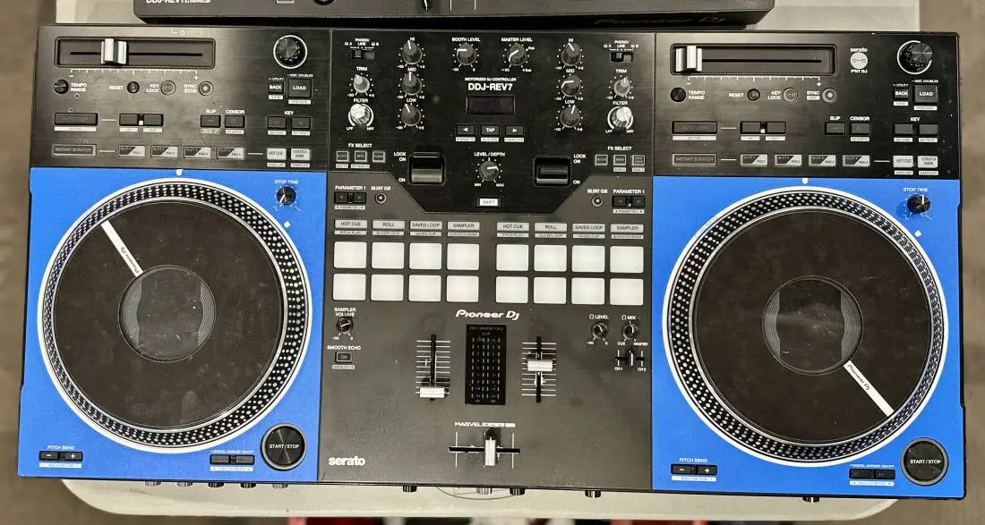 The DDJ‐REV7 controller boasts a scratch‐style design and features motorized jog wheels with On Jog display. The fact that the jog wheels are larger (7 inch) and vinylized wheels with customizable settings means that DJs are in for a tactile connection to tracks. What's more, two included slip sheets allow users to experiment with torque and friction for the perfect experience. The DDJ‐REV7 also inherits Pioneer DJ's renowned Magvel Fader Pro stick for a slick and accurate response while scratching. New beat FXs and an included voucher for Serato DJ Pro round out this premium unit setup.