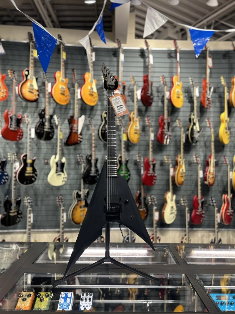 The LTD Black Metal Series are guitars that are comparable in build quality to ESP's LTD Deluxe "1000 Series" instruments, but with a dark and menacing design theme of all-black finish, components, and hardware, a single premium-quality pickup, Macassar ebony fingerboards with no inlays and glow-in-the-dark side markers, and even a newly-designed black metal LTD logo on the headstock. The Arrow Black Metal takes the bold, extreme Arrow body shape and presents it in the killer Black Metal design scheme, with a single aggressive EMG 81 pickup, a single volume control, and an EMG TKO kill switch.