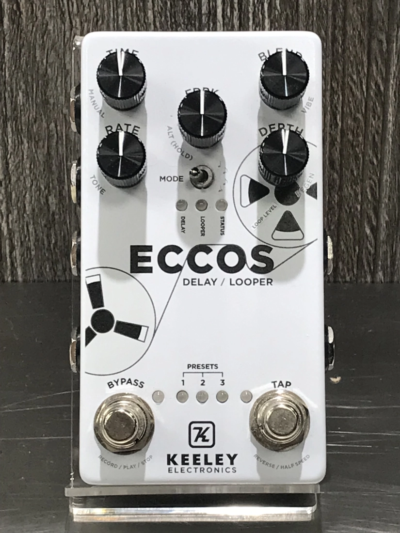 The ECCOS Delay Looper is based on a new stereo, flanged delay tone. Create beautiful sounding tape style delay lines and then spin them endless with the Looper! Designed to be at home in live pro rigs or bedroom studios while experimenting. The Keeley ECCOS is a delay-looper workstation with superb sound quality and abundant features.
