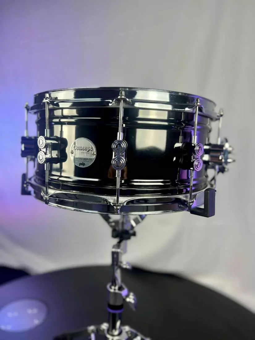 The Concept Series Black-Nickel-Over Steel Snares offer drummers a brash, sleek-looking snare drum with a lower pitch, dynamic attack, and bright resonance that cut through any mix as a main or side snare. These drums feature a 1mm-thick, dual-beaded, rolled-steel shell, plated in a mirror-like, black nickel finish. Each of these drums is fitted with PDP's dual-turret lugs, DW MAG throw-off and True-Pitch tension rods, and world-class drum heads from Remo. The snare wires are fully-chromed, with carbon steel coils and brass end plates, for exceptional texture and control. The Black Nickel Over Steel Snares are offered in variety of sizes to help you dial in your specific sound. *