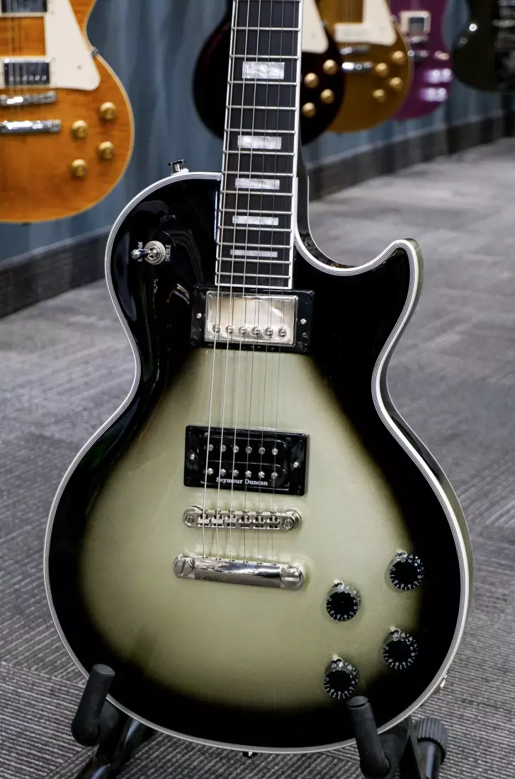 This model from the Adam Jones Les Paul Custom Art Collection features Julie Heffernan's "Self Portrait as Not Dead Yet" on the back. It is also an exceptional instrument for your next musical masterpiece. It has a bound mahogany body with a maple cap, a three-piece bound maple neck with an Adam Jones Custom profile, and an ebony fretboard. It is equipped with a reverse-mounted Epiphone ProBucker™ Custom humbucker™ in the neck position and a Seymour Duncan® Distortion in the bridge; both are wired to CTS® potentiometers and Orange Drop® capacitors. A Marquee back plate with the artist's name and the name of the artwork is also included. Finished in Antique Silverburst as an homage to Adam's beloved original Silverburst 1979 Gibson® Les Paul Custom, a Protector hardshell case is also included.