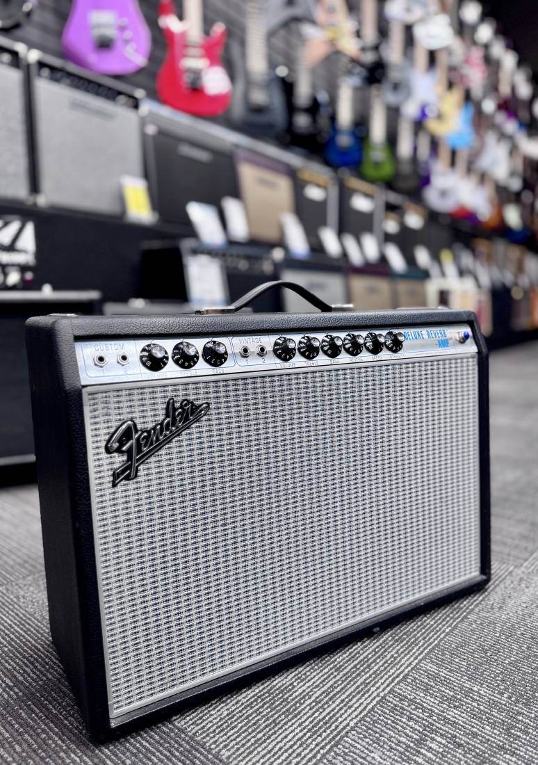 The 68 Custom Deluxe Reverb Amp pays tribute to the classic look, sound and performance of Fender's late-60s silverface amps. In a special twist, both channels boast reverb and tremolo, and the custom channel has a modified Bassman tone stack that gives modern players greater tonal flexibility with pedals. The amp also features quicker gain onset and reduced negative feedback for greater touch sensitivity. The 68 Custom Deluxe Reverbs single 12 Celestion G12V-70 speaker also delivers a more distinctively rock n roll flavor.