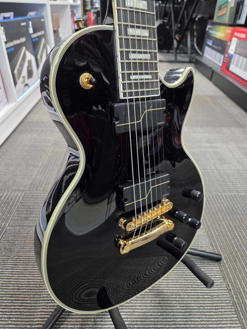 Epiphone is proud to present the third signature model designed in partnership with Trivium's extraordinarily talented Matt Heafy - the Matt Heafy Les Paul Custom Origins. It features a pair of custom-voiced Fishman Fluence pickups. Each delivers three distinct tones. The Alnico neck pickup provides a modern, active, high output Alnico humbucker sound, a crisp, clean, and fluid neck humbucker sound, and a glassy, scooped, hi-fi single coil sound. The Ceramic bridge pickup offers a choice of modern, active, high-output ceramic humbucker tone, high output passive ceramic hum bucker tone, and a cutting, overwound single coil tone. These tonal options are selected with push/pull volume and tone pots. The maple-capped mahogany body has modern weight relief for hours of comfortable play, and the mahogany neck has a fast-playing SpeedTaper D profile and a contoured heel for exceptional upper-fret access. Gold hardware, including locking Grover Rotomatic tuners with Tulip buttons, and classic Les Paul Custom cosmetics make this a standout guitar on-stage. Available in Ebony and Bone White gloss finishes. A custom hardshell case is included.