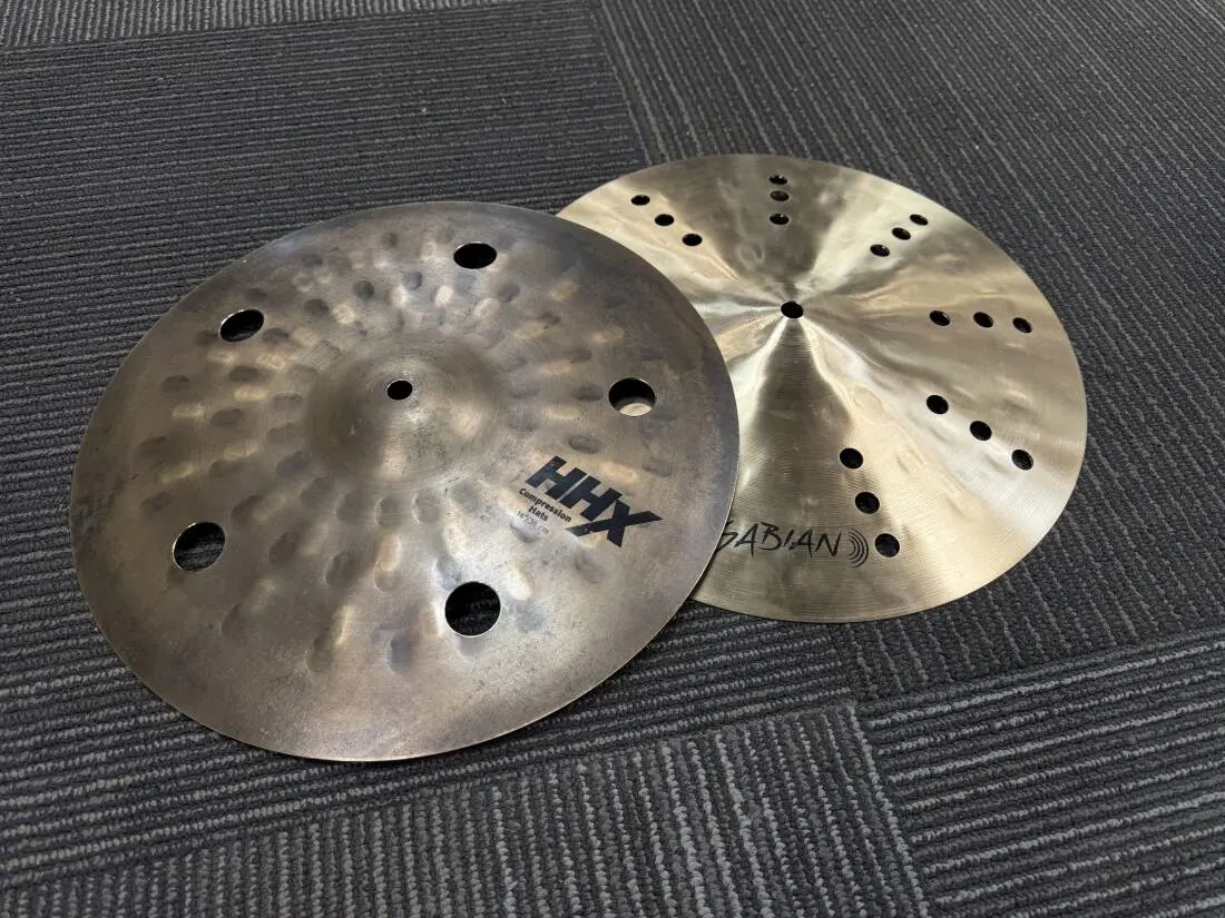 This pairing is a combination of an un-lathed, aggressively hammered medium weight top, with 5 one-inch air holes. The bottom is fully lathed and heavy, with Sabian's Aero hole design. The holes in both the top and bottom result in a loud foot chick, with a trashy slap effect. Overall, the sound has a metallic/industrial type attack, and a trashy sizzle effect when played slightly open. Definitely a progressive sounding pair of hi hats.