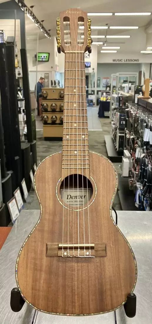 What do you get when you cross a 1/4 sized guitar with a ukulele? The Denver guitalele! With a body of polished acacia, blackwood fingerboard, gold tuners and abalone rosette and binding, the Denver guitalele is ready to be your traveling companion.