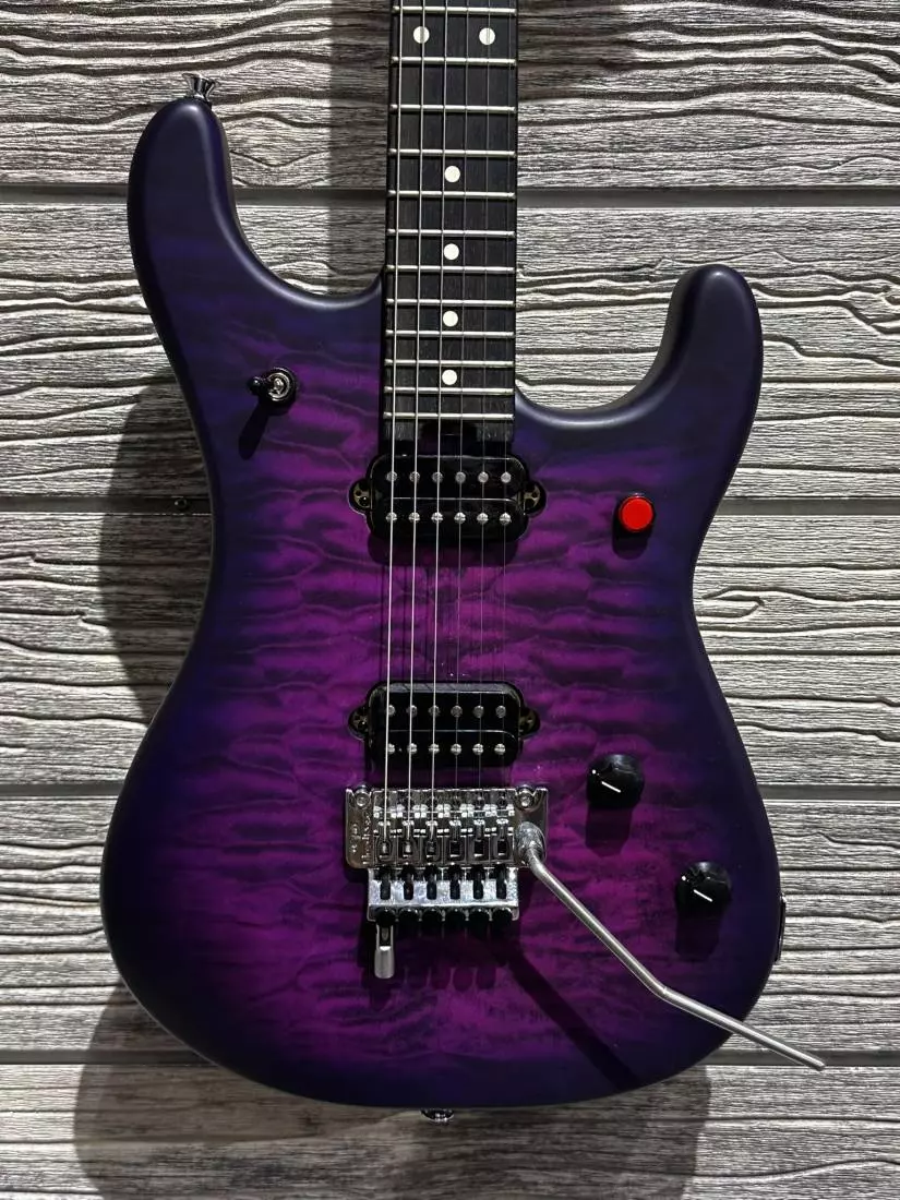 Decked out with a "dive-bomb" certified EVH-branded top-mount Floyd Rose® bridge, the locking tailpiece features fine tuners for each string and a patented EVH D-Tuna® for switching back and forth from drop-D to standard tuning in an instant. A stylized modern spin on a fan favorite, the 5150 Deluxe is sure to stun with its rippling quilt maple top dressed in a vivid Purple Daze finish with all-chrome hardware, including the EVH-branded Gotoh® tuning machines.