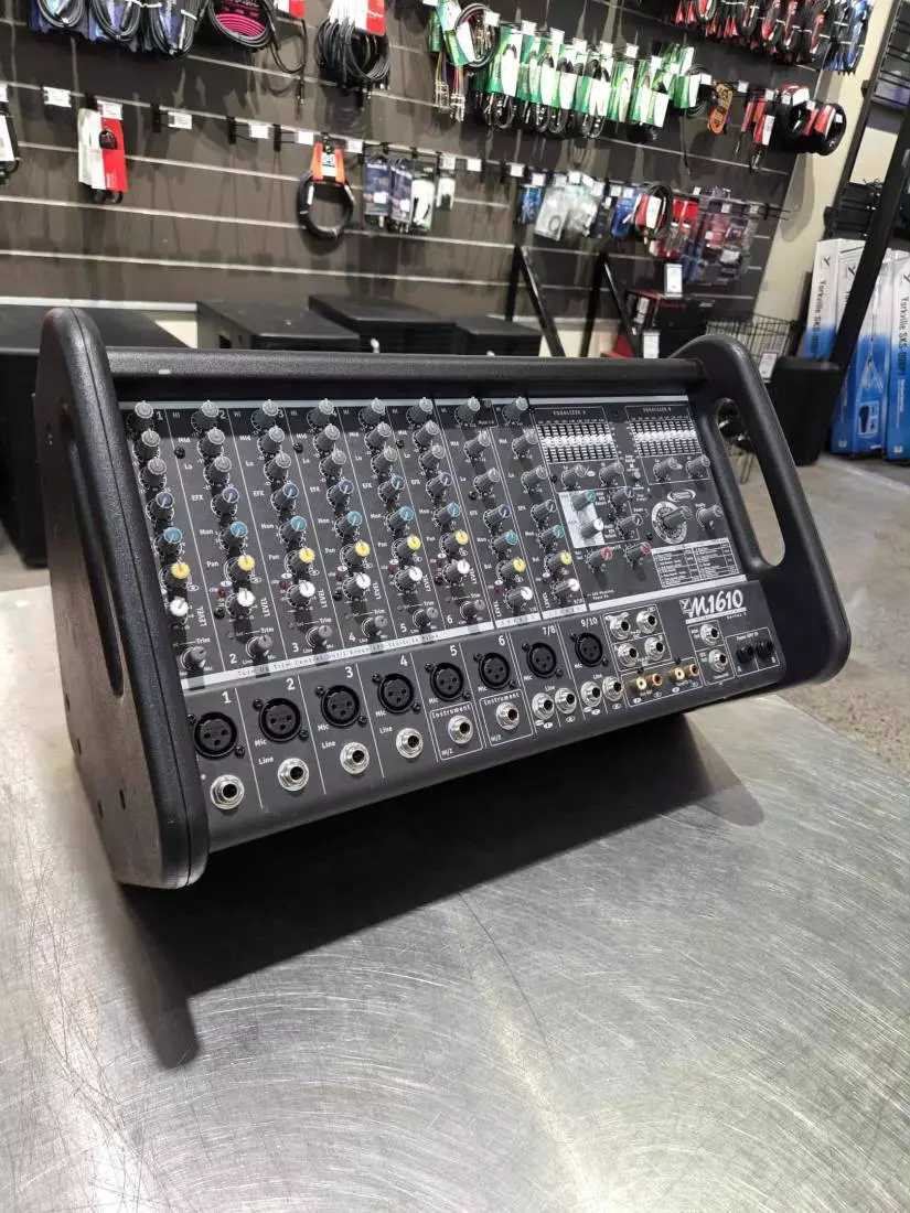 A uniquely angled control panel immediately sets the Canadian-made M1610-2 apart from its "box mixer" cousins and is your first clue that this is no ordinary mixer/amp. In fact the M1610-2 is possibly the most versatile and professional unit of its kind on the market in the 1600-Watt power range. Combining the convenience, lighter weight and small footprint of a box mixer with the tilt-back visibility and channel control access of a desk mixer helps to define the M1610-2 as something visibly more professional than the norm. As well, the M1610-2 can be rack-mounted with its optional RK1610 kit.