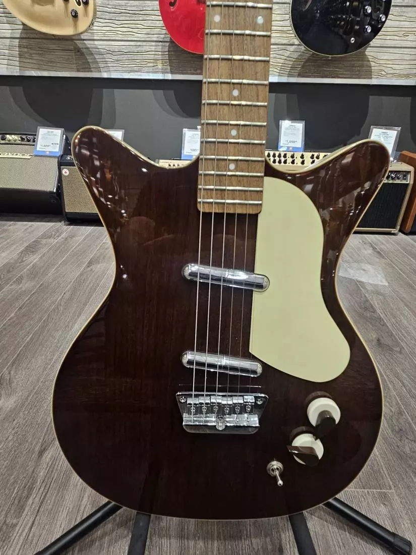 Open the pearly gates! Danelectro® launched this in 1959, naming it the "Deluxe". A huge understatement! This hot reissue features Danelectro's Vintage 50's Lipstick® pickups, adjustable bridge, front and back binding, pointer knobs, and Gotoh® vintage 15:1 tuners.