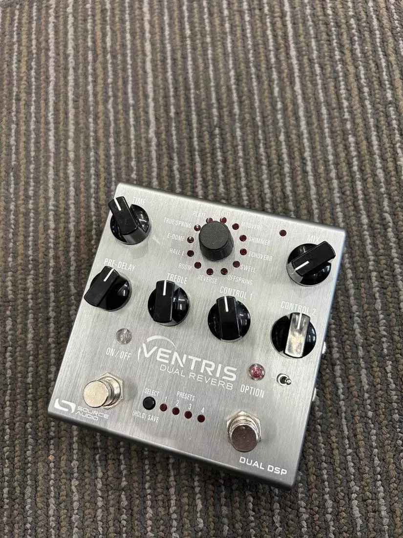 The Ventris Dual Reverb also features a long list of mandatory control functions and introduces some bold new ones. The A+B toggle switch makes it super-easy to select between the pedal's two signal processors or combine them into entirely unique dual reverb effects. Stereo Inputs and Outputs provide a mega-wide stereo spread for larger-than-life ambience. The OPTION Footswitch offers a variety of hands-free control options including preset scrolling, A to B processor toggling, reverb hold, runaway reverb, and tap tempo. The Ventris also features 8 onboard presets, full MIDI functionality (extending the preset number to 128), expression control, external preset switching, and more.