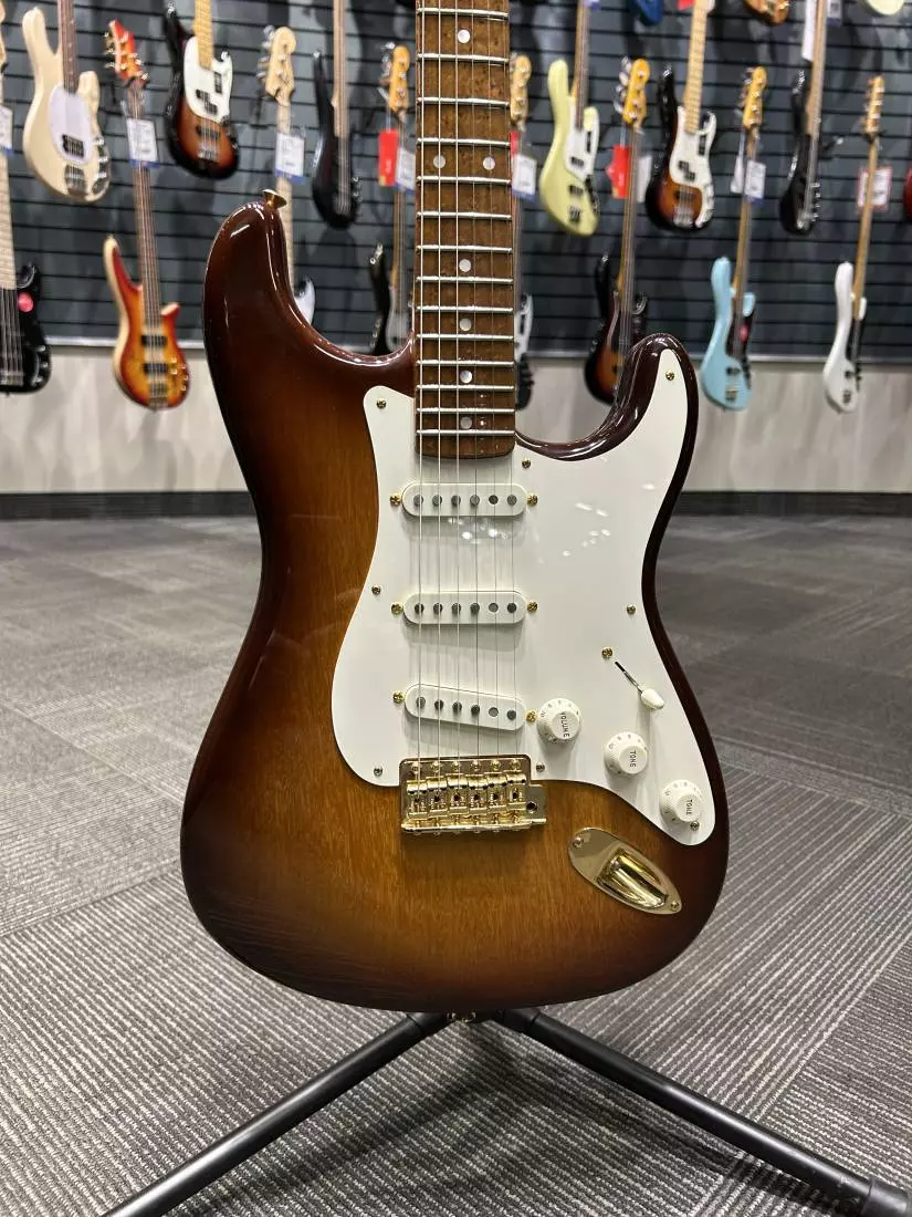 The Artisan Okoume Stratocaster is a perfect combination of striking form and legendary Fender functionality. Mesmerizing in looks and sound, its '56 Strat body is crafted from premium okoume and finished in classic chocolate sunburst. Featuring a comfortable 10/56 "V" profile, the bird's-eye maple neck is "roasted" to a dark caramel color to match the bodys edges and finished with nitrocellulose lacquer for ultimate breathability and feel. Complete with gold hardware, a trio of handwound single-coil '69 Strat pickups and a wealth of cosmetic upgrades, each unique model is a feast for eyes and ears alike.