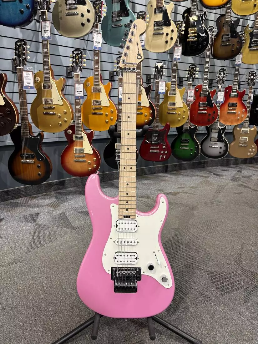 Packed with plenty of So-Cal flavor, this stylish axe is wrapped in Platinum Pink and features a white pickguard and chrome hardware.