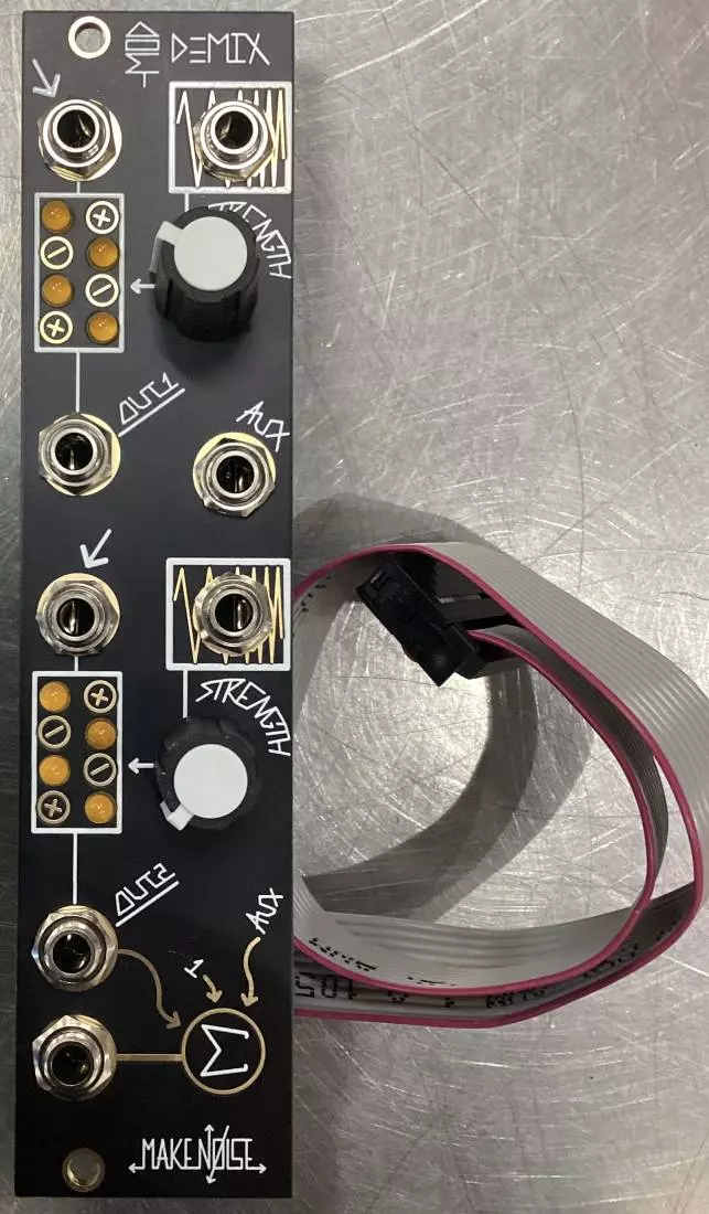 Unique balanced modulator circuit turns off around zero volts at the Carrier/ Control Input, making the circuit behave well as a VCA. Strength is a Combo Knob, with nothing patched to STRENGTH CV IN, it works as a standard panel control, setting Level. With signal patched to Strength CV Input, it works as an attenuator, setting the strength of the modulation. Both circuits feed a summing stage, allowing the module to be used as a voltage controlled mixer. Auxiliary Input allows for the stacking of multiple modDemix and/ or Optomix to create larger mixes. Part of a decentralized mix console integrated throughout the system along with Optomix, X-PAN, Dynamix, and RxMx. Able to introduce warm distortions to audio signals, sounds like no other VCA or Ring Mod. MAX BLINKENLIGHTS, 8 LEDs packed into a small 6hp module. Pairs well with MATHS and Optomix.