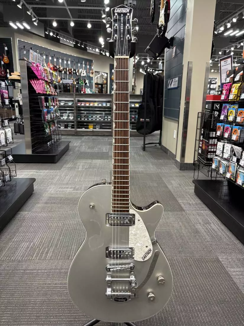 With its chambered mahogany body with set-in mahogany neck, dual Gretsch mini-humbuckers, and Bigsby B50 Vibrato tailpiece, the Pro Jet definitely breaks the sound barrier! Other features include a rosewood fingerboard, anchored Adjusto-matic bridge, volume and tone controls, and die cast tuners. Finished in gloss walnut stain.
