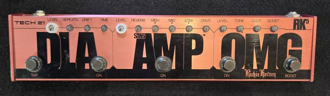 While Richie primarily uses his RK5 live in conjunction with his standard amp rig, this sleek, compact unit embodies an entire rig on its own. At its heart, is the all-analog SansAmp, which makes it possible to go direct to a PA or mixer. For effects, you have the essentials: a reverb, a delay with tap tempo, a powerful boost, and Richies Signature OMG overdrive.