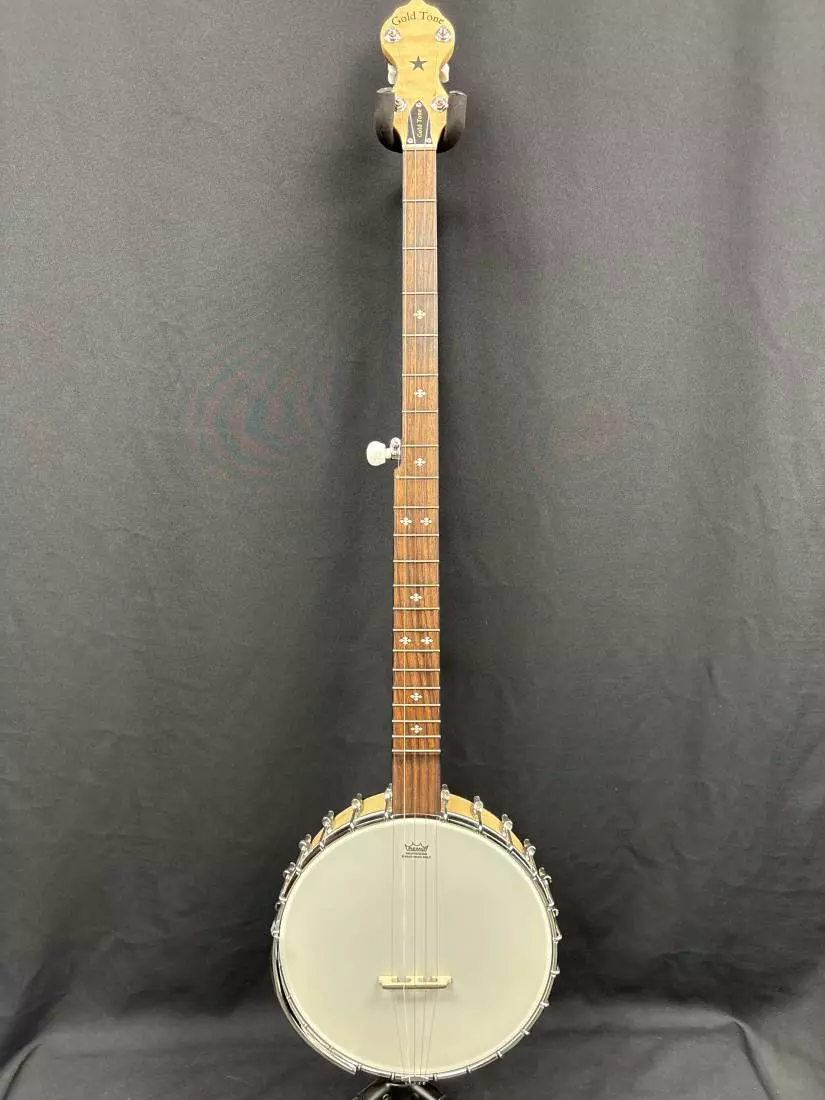 The Maple Mountain 150LN exemplifies Gold Tone's mission: to give you the best instrument for your money. This long necked version of the MM-150 offers features found on many higher-priced banjos for less than you'd expect to pay. The half-inch-thick maple rim carries an authentically-designed Whyte Laydie-style scalloped three-piece brass tone ring under an eleven-inch Remo Renaissance head. Premium parts include a comfortable maple neck, rosewood fingerboard with snowflake inlays and a frailing scoop, vintage Fairbanks-style headstock design, planetary tuners, Vega-style armrest, and No Knot tailpiece. The MM-150LN is completely set up at the Gold Tone Factory.