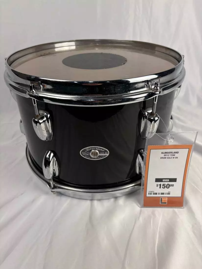 Vintage Slingerland 8"x12" tom circa. 1979-80 in Black wrap finish (model 61411 in 1979 Slingerland catalog). 5-ply shell without reinforcement rings, Set-O-Matic tom bracket in good working condition. Top bearing edge appears to have been re-cut with a 45-degree inward cut (see photo 3). Drum sounds great and has great sustain!
