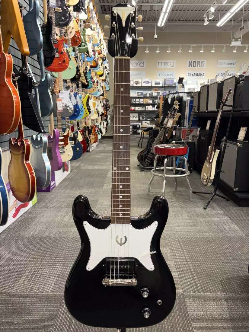 First introduced in 1958, the Epiphone Coronet was one of Epiphone's first and most successful original solid body electric guitar designs. The latest version brings back many of the features of the early Coronet models including the symmetrical double-cutaway mahogany body with a single Epiphone PRO P-90 Dogear pickup, three on a side reduced sized Kalamazoo headstock with Epiphone Bikini badge and ivory button tuning machines, and a white butterfly pickguard with foil E logo. The Epiphone Coronet comes equipped with a glued-in mahogany neck with a medium C profile, Indian laurel fretboard with 12" radius and 22 medium jumbo frets, 1 volume and 1 tone control with CTS potentiometers, and an Epiphone Lightning Bar compensated wraparound bridge.