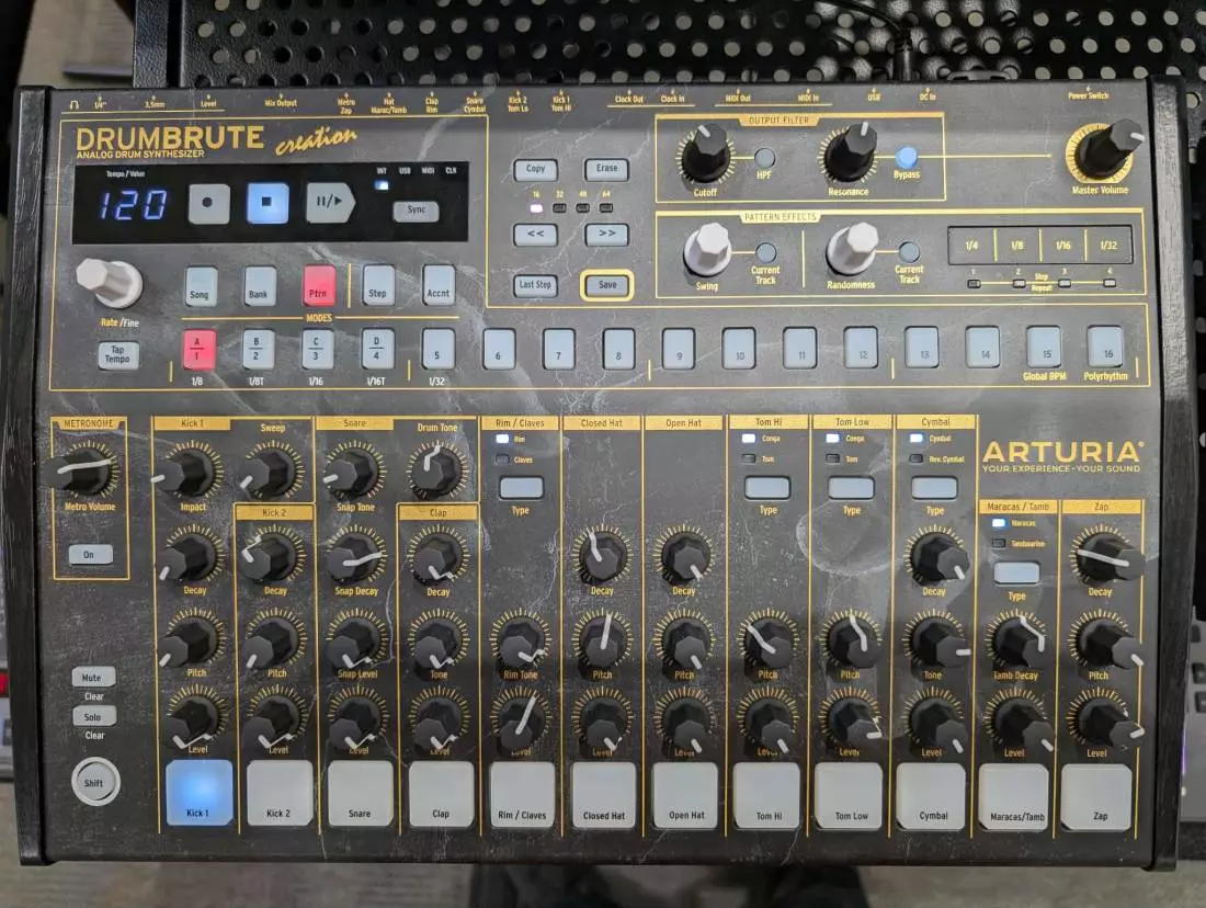 The DrumBrute features 17 pure-analog drum sounds, which build on the history of classic drum machines and offer an expanded feature set including high-performance effects and a modern step sequencer. The unit offers a wide range of controls, which allow for many new and adventurous sounds including two flavors of kick drums and an unusual reverse cymbal effect. There are 12 individual outputs available, should you wish to mix or effect the sounds with an outboard mixer or effects.