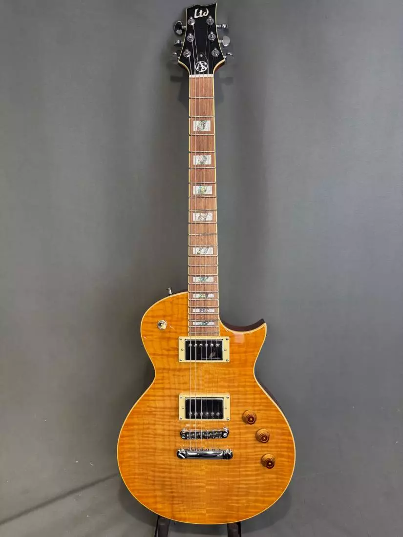 Its contemporary set of tools include a set-thru, U-shaped three-piece maple neck for smooth access all the way up and down the fingerboard. It comes with an excellent set of Seymour Duncan '59 (neck) and JB (bridge) pickups. Its flexible controls include individual volume knobs for each pickup, a tone control with push-pull access to spilt the pickup coils, and a pickup selector toggle. Its high-end components include a bone nut, TonePros locking TOM bridge and tailpiece, Dunlop straplok, and Grover tuners. The LTD AS-1 comes in an amazing-looking Lemon Burst or Black Aqua Sunburst translucent finish over its figured flamed maple top.