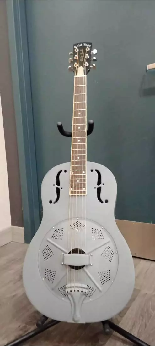 The Gold Tone GRS's full-depth steel body takes the energy generated by the authentic reverse-cone resonator and biscuit bridge and pumps it out relentlessly. The new Gold Tone/Beard resonator coverplate features a removable palm rest making it a breeze to adjust string action, break angle, string spacing or to replace the bridge saddle without remove all that hardware. Available as left-handed model.