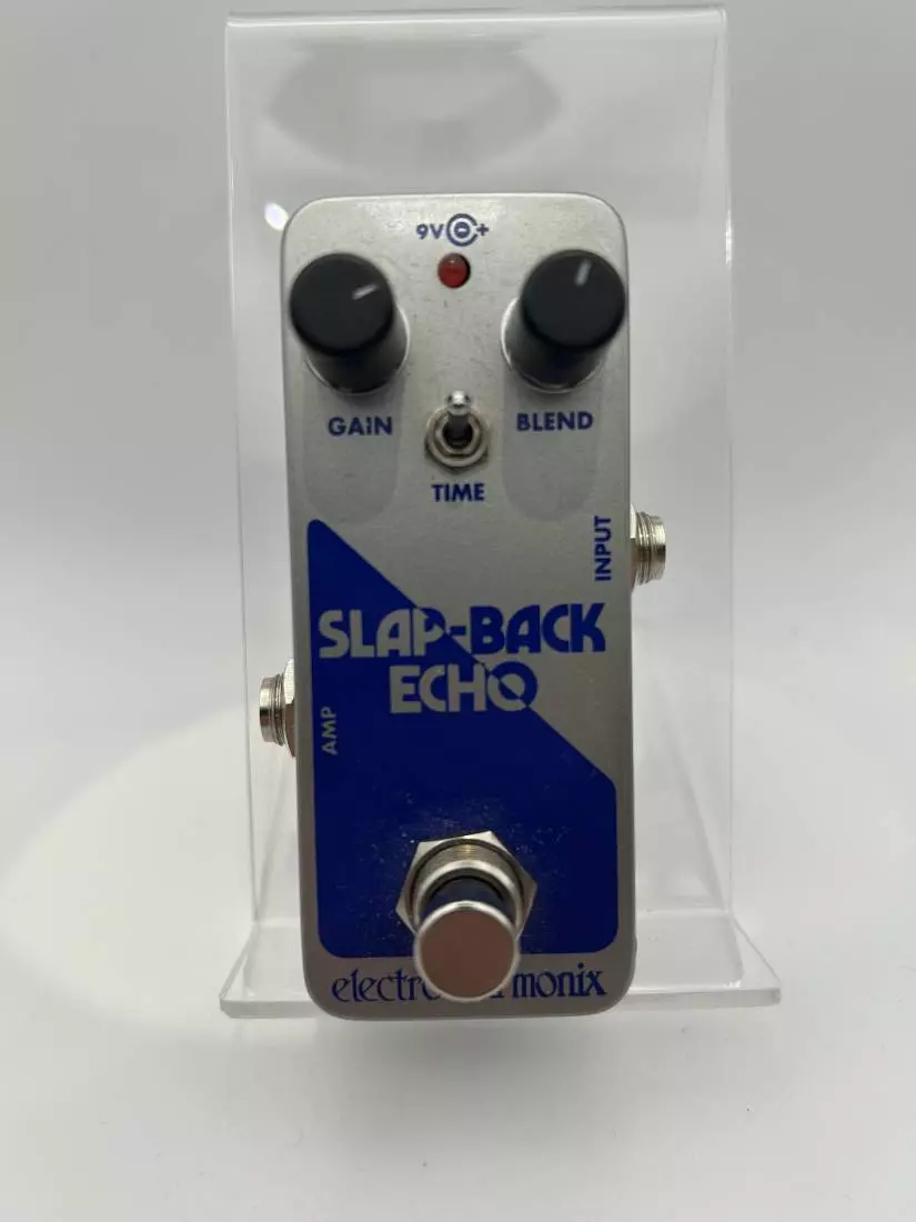 Housed in EHX's Pico-sized chassis, the Slap-Back Echo features Gain and Blend knobs as well as a Time switch. The Gain knob controls the input signal before the echo circuit and also adjusts the overall volume at the output with a boost of up to +20dB. The Blend knob mixes the dry signal and the echo signal from 100% dry to 100% echo. The Time switch selects between three different delay times: 45ms, 65ms, and 100ms.