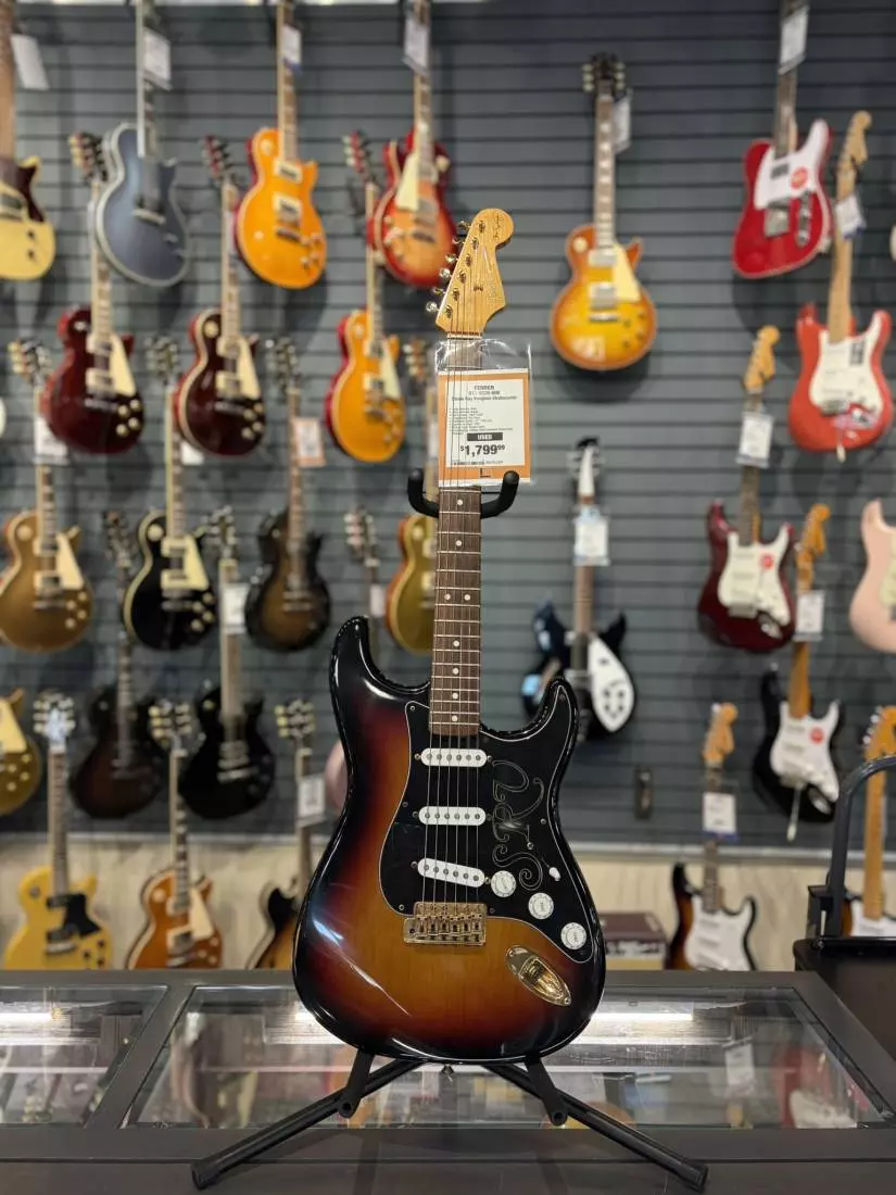 The legendary Stevie Ray Vaughan collaborated with Fender to produce a signature Stratocaster guitar shortly before his tragic and untimely death in 1990. The resulting Stevie Ray Vaughan Stratocaster features an early 60s oval neck shape, pao ferro fingerboard with jumbo frets, three Fender Texas Special single-coil pickups, gold-plated hardware, inverted left-hand vintage tremolo unit and distinctive SRV pickguard. Our homage to a true master.