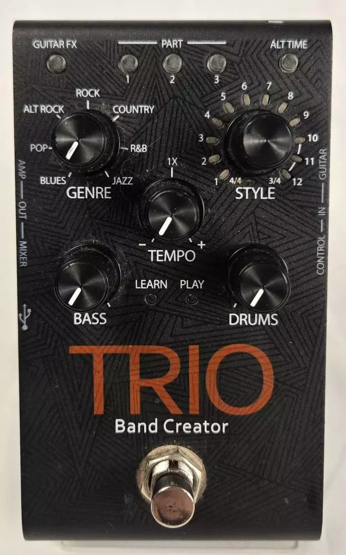 The TRIO listens to the way you play and automatically generates bass and drum parts that match your song. Just plug your guitar into TRIO, press the footswitch to teach TRIO your chords and rhythm, then press the footswitch again to start playing with your own personal band!