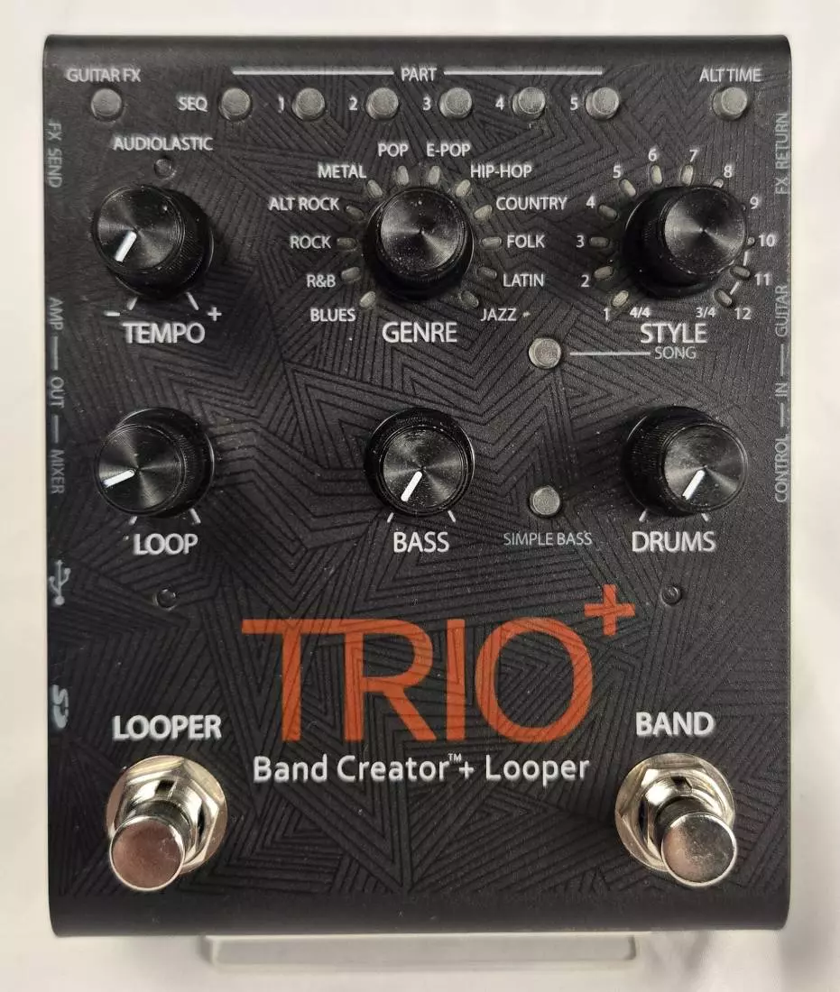 The TRIO+ is a simple-to-use guitar pedal that listens to the way you play and automatically generates bass and drum parts that match your song. Just plug your guitar into the TRIO+, press the Band footswitch to teach the TRIO+ your chords and rhythm, then press the Band footswitch again to start playing with your own personal band! Bass and drum levels can be adjusted for the perfect mix using the TRIO+'s Bass and Drums knobs. The TRIO+ also features a Simple Bass button lets you select between 3 bass line modes for busy or simple bass lines.