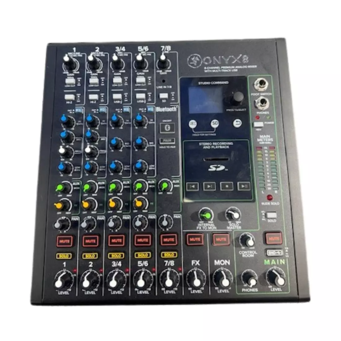 The Mackie Onyx8 8-Channel Premium Analog Mixer with USB is the ultimate compact solution for live audio, home recording, and content creation. 24-Bit / 96kHz multitrack recording, award-winning, high-gain Onyx mic preamps, and an end-to-end ultra-low-noise design deliver the sound quality professionals demand. Packed with features including powerful DSP effects, British-style Perkins EQ, full-color display, and integrated recording and playback from an SD card. The Onyx8 Premium Analog Mixer gives you the power you need to capture your best performance with pristine fidelity at home or on the go.