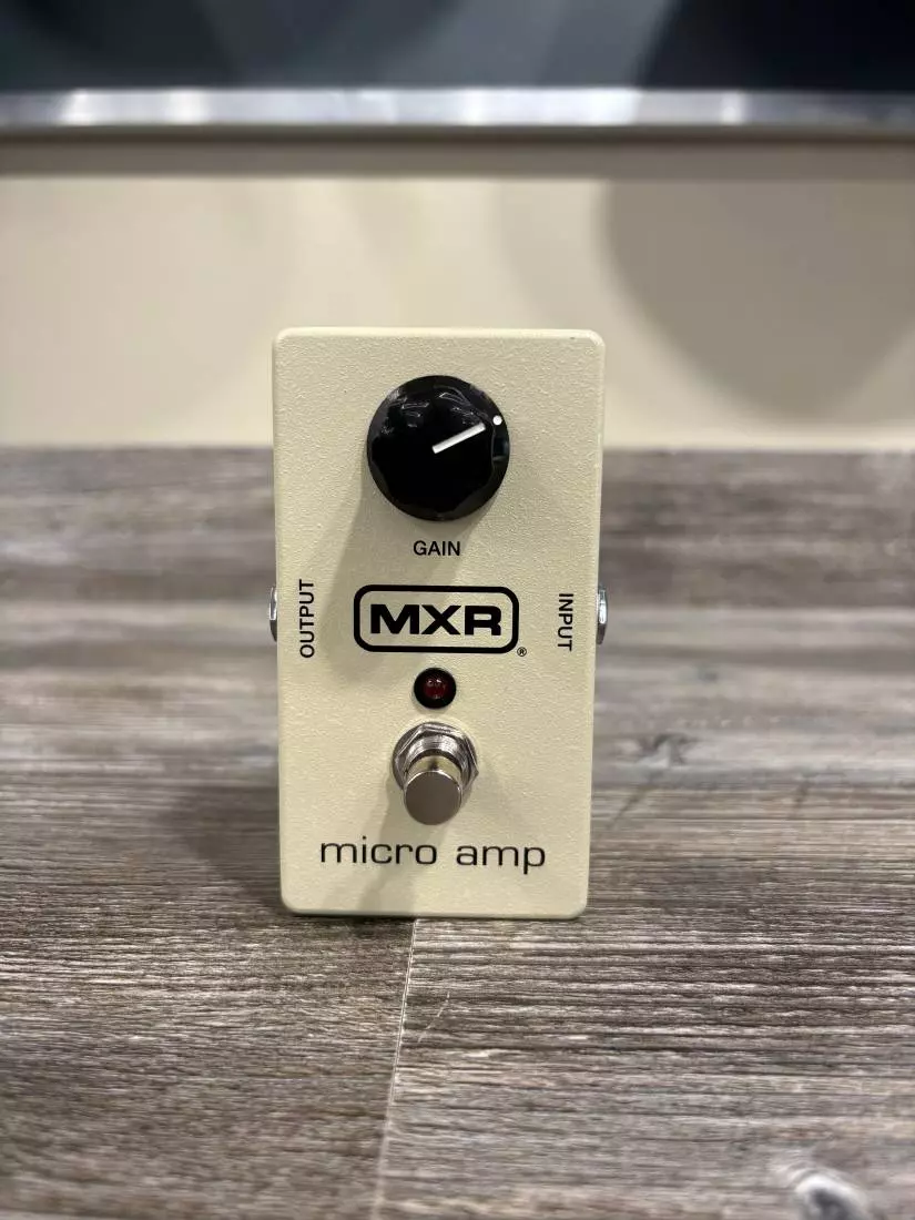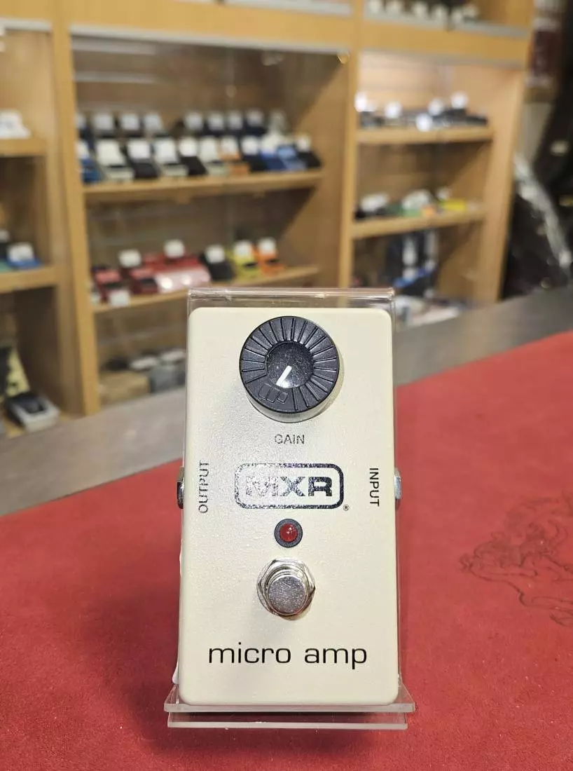This device adds a preset amount of gain, using a single control. With a guitar, this lets you boost your signal for lead work, adjust between two different guitars with unmatched output (i.e., humbucker to single coils), or it can supply a permanent boost in a long effects chain where signal drop off is a problem. Power: Single 9-volt battery or Dunlop ECB-003 AC Adapter - Controls: Footswitch toggles amp on/bypass (red LED indicates on) Gain knob adjusts total output volume when micro amp Is engaged