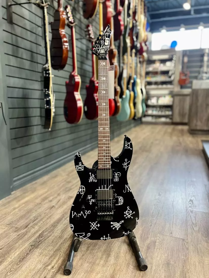 Metallica's Kirk Hammett is fascinated by the strange and macabre aspects of life, evidenced by his custom guitars featuring classic horror art and paranormal phenomena, most famously seen in his well-known Ouija guitars. The next step in his LTD Signature Series is the KH Demonology, a guitar powerful enough to summon the mightiest of dark forces. Over its black finish are a number of sigils, which are ancient symbols reputed to be imbued with magical power that allows the owner to summon demonic entities. Whether or not you use the KH Demonology as a portal to magical dimensions, it's an amazing musical instrument in its own right. The KH Demonology is a neck-thru-body design at 25.5" scale, with a comfortably contoured alder body, an extra-thin U-shaped three-piece maple neck, and a pau ferro fingerboard inlaid with Kirk's skull-and-crossbones motif, along with 24 extra-jumbo frets. A set of EMG Kirk Hammett Bone Breaker Signature pickups provide a range of tones that go from deep and rich to super aggressive with the flick of a toggle switch, and each pickup has its own volume control. The KH Demonology LH includes a Floyd Rose tremolo for expressive performance styles, and comes with black ESP case.