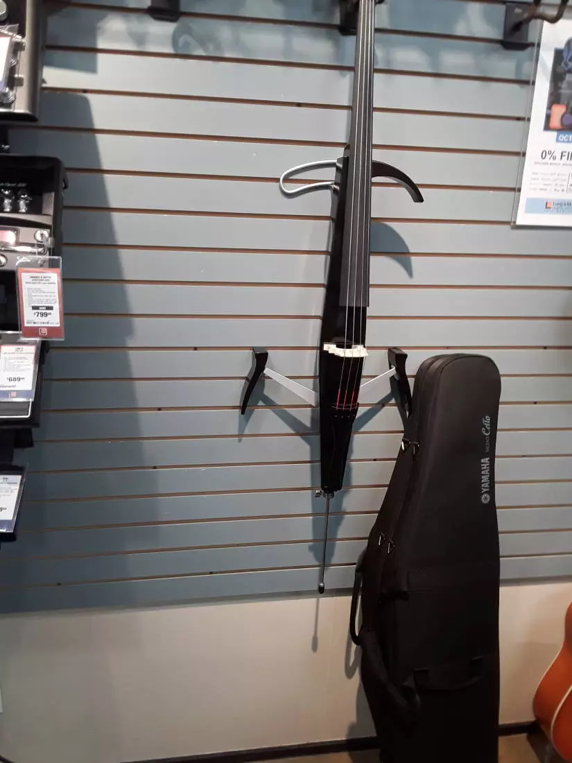 Full size black 4/4 cello is easy to hold and play and the chest support, when attached during performance, offers the natural feel and resonance of an acoustic cello. Protective gig bag and headphones are included!