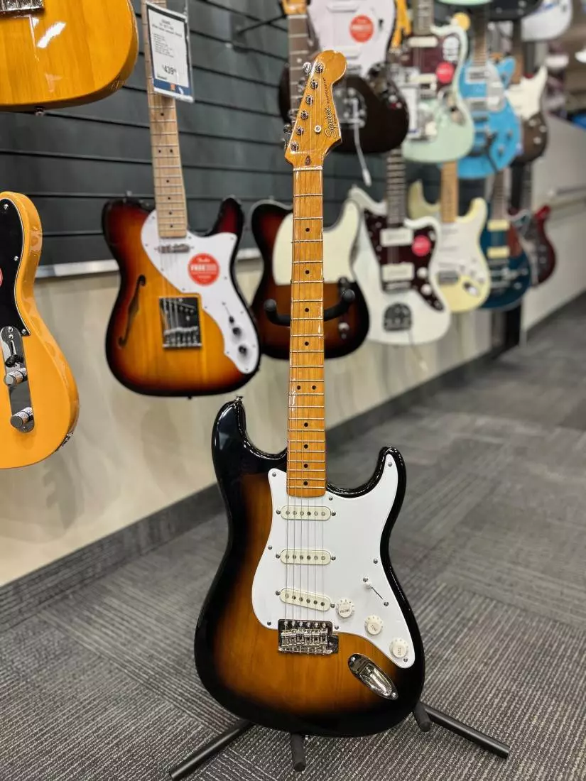 A celebration of the birth of the Strat® in the 1950s, the Classic Vibe '50s Stratocaster creates incredible tone courtesy of a trio of Fender-Designed alnico single-coil pickups. Player-friendly features include a slim, comfortable "C"-shaped neck profile with an easy-playing 9.5"-radius fingerboard and narrow-tall frets, as well as a vintage-style tremolo system for expressive string bending effects. This throwback Squier model also features 1950s-inspired headstock markings, rich-looking nickel-plated hardware and a slick vintage-tint gloss neck finish for an old-school vibe.