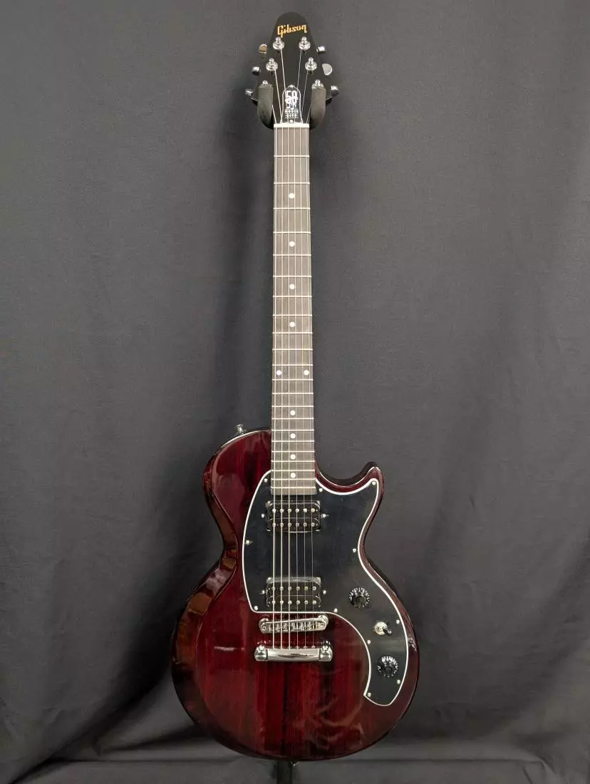 The hardware is chrome-plated, including the Nashville Tune-O-Matic™ bridge, aluminum Stop Bar tailpiece Grover® Mini Rotomatic® tuners, and output jack plate cover. A black 5-ply pickguard holds two Gibson 70s Tribute humbucker™ pickups, which are wired to an intuitive and comfortable control layout consisting of master volume and master tone controls with black Top Hat knobs and a three-way pickup selector toggle switch. A premium soft shell case is included to keep the Les Paul Music City Special - 50th Anniversary safe when stored or in transport. The Les Paul Music City Special - 50th Anniversary is available in Ebony, Wine Red, and Tobacco Burst gloss nitrocellulose lacquer finishes, and each has a commemorative 50th Anniversary truss rod cover.