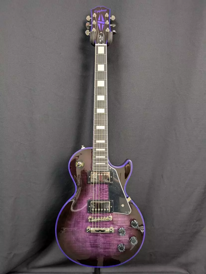 This Epiphone Les Paul Custom Widow electric guitar is a bold reinterpretation of a classic design, offering premium craftsmanship and striking aesthetics. Part of Epiphone's Inspired by Gibson Collection, this guitar features a mahogany body with a flame maple top, delivering rich sustain and articulate brightness. The ebony fingerboard with pearloid block inlays adds visual elegance while ensuring smooth playability. Equipped with ProBucker Custom humbuckers modeled after Gibson Custom's acclaimed pickups, this instrument provides iconic Les Paul tone with dynamic versatility. The Widow's color-matched binding and chrome hardware create a standout look, making this guitar as visually captivating as it is sonically impressive.