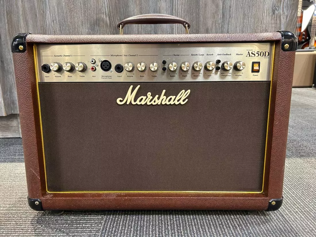 Marshall's AS50D is a 50-watt, 2 x 8", acoustic guitar combo amp with 2 channels, including a phantom-powered microphone channel. It features a redesigned tweeter, digital chorus and reverb and an anti-feedback notch filter. Each channel sports its own volume, EQ, FX loop and D.I. output. Master volume, line out and RCA inputs round things out nicely.