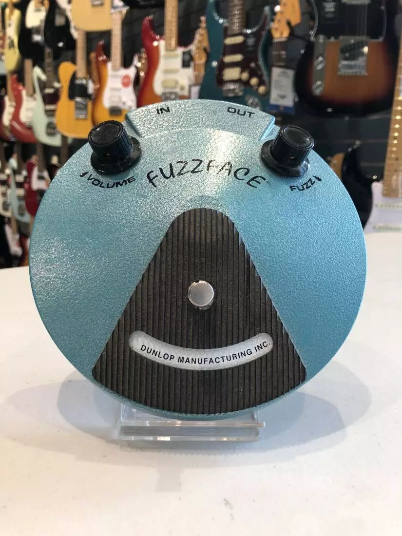 Hendrix was the master of fuzz - an artist with many subtle shadings at his command. His love affair with the legendary Fuzz Face pedal began in the early days of the Experience and continued to evolve throughout his brief but blazing career. The Dunlop Jimi Hendrix Fuzz Face is a meticulously faithful reproduction of the 1969-70 Dallas Arbiter Fuzz Face that Jimi used on classic albums like Band of Gypsys. Dunlop - engineering department examined hoards of vintage Fuzz Faces, honing in on a few units which possessed that unmistakable Jimi voodoo. The Hendrix Fuzz Face is built around the toneful BC108 silicon transistor. It is authentic in every detail - a handwired brown circuit board and circuitry carefully matched to the original specs. The look is 100% accurate too - that groovy circular chassis with tooled clones of the original Fuzz Face knobs in the rare and vintage turquoise hammertone finish. A truly playable collectible for any Hendrix or Fuzz Face fanatic.