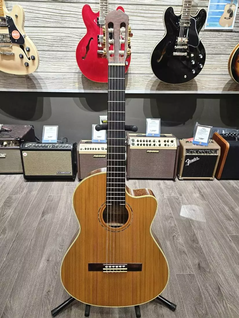 Single cutaway classical body, round soundhole with abalone shell, solid cedar top, burl mahogany back and sides, 14/20-fret rosewood fingerboard with snowflake/cat's-eye inlays, three-per-side die-cast tuning machines, maple and natural wood binding, rosewood direct coupled bridge, Standard System 600T electronics, available in Natural finish, mfg. 2003-04.
